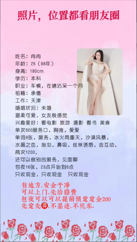 年龄20 ,河北人来天津短开一个月,自己说是本科学生兼职车模,身材确实车模身材,是不是学生就不知道了,毕竟野鸡三本也是本科生,前胸大面积纹身。月初在塘沽开,前天看PYQ说搬到河西了,课表照片都在下面了,想去的LY自己联系吧。这个号应该是塘沽几个人共用的经常换人。
